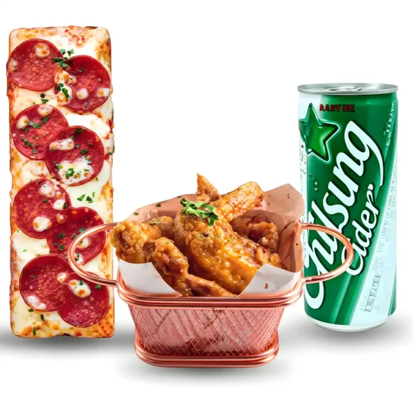 1 Pizza (Pepperoni/Bulgogi/Rose/Fire Bulgogi/Tteokbokki) +1 Dish (French Fries/Chicken Wings) + 1 Beverage.